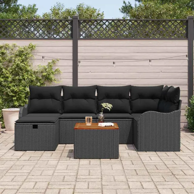 vidaXL Vrtna sedežna garnitura z blazino 7 pcs Črna poli ratan