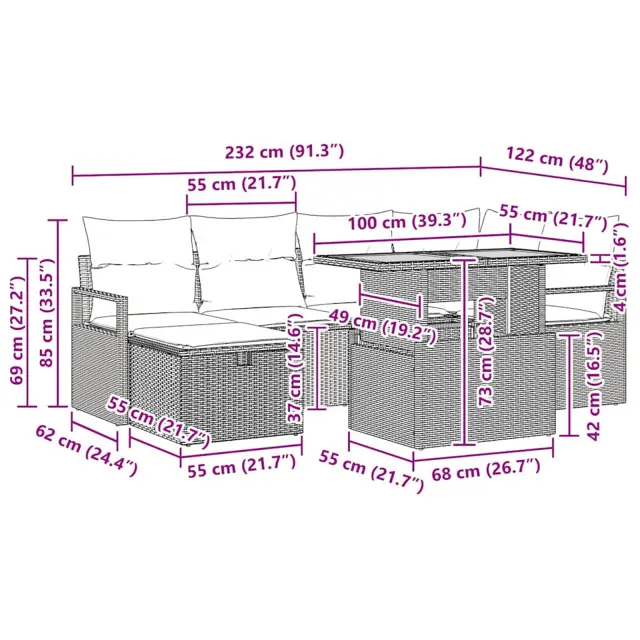 • Funkcionalni elementi: Vsak sedežni modul ima udobno blazino in naslonjalo iz poli ratana. Skriti shranjevalni predali klopi dodajajo praktičnost, saj omogočajo shranjevanje blazin in drugih stvari.