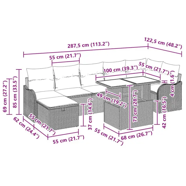 Ta moderni zunanji sedežni komplet je zraven vsakega, ki uživa v druženju na vrtu ali terasi. S svojim trendovskim pletenim zaključkom in preprostim stilom se super ujema z modernim dizajnom. Predstavljajte si sproščen popoldan s prijatelji, kjer se lenarite na udobnih blazinah, obdanimi z naravo. Odlično je za sproščanje in zabavo, prinaša prijetno in vabljivo vzdušje na vsak zunanji prostor.