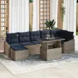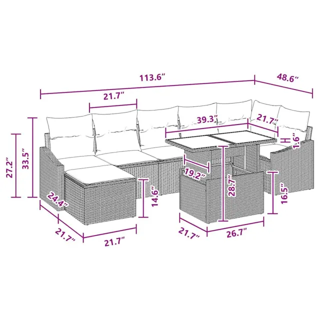 Ta moderna vrtna sedežna garnitura s blazinami bo prava izbira za vsak zunanji prostor. Povezuje udobje in stil s svojim kotnim sedežem, središnjimi sedeži, naslonjalom, poufom in mizo. Celoten videz je urejen in praktičen, kar omogoča odlično razporeditev, idealno za teraso ali vrt. Njene čiste linije in uravnotežena oblika ustvarjajo vabljiv prostor za sprostitev in zabavo.