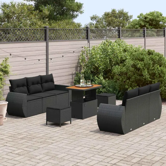 vidaXL Vrtna sedežna garnitura z blazino 9 pcs Črna poli ratan