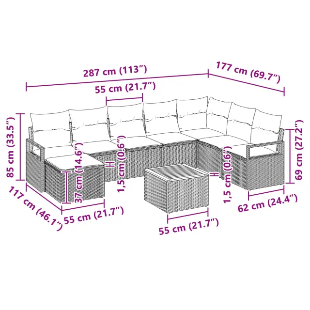 Ta modularni vrtni set je za vse, ki cenite moderno poenostavitev in funkcionalnost na zunanjih prostorih. S čistimi linijami in enostavnim dizajnom prinaša klasično estetiko v vaš vrt ali teraso. Popoln je za druženja spomladi in poleti, saj se prilagaja in vabi, kar obljublja, da bodo vaši zunanji trenutki še boljši z udobjem in slogom.