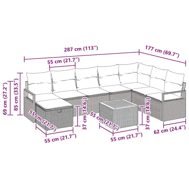 • Vključene komponente: Ta set vključuje vsak del s skrbno izdelano hrbtno stranjo in ponuja več praktičnih modulov, kot so centralni, vogalni in naslonjeni sedeži, poleg priročnega footstoola in mize. Udobne blazine z zadrgami omogočajo enostavno vzdrževanje, integrirana shranjevalna omarica pa poskrbi za diskretno shranjevanje malenkosti, kar še dvigne funkcionalnost.