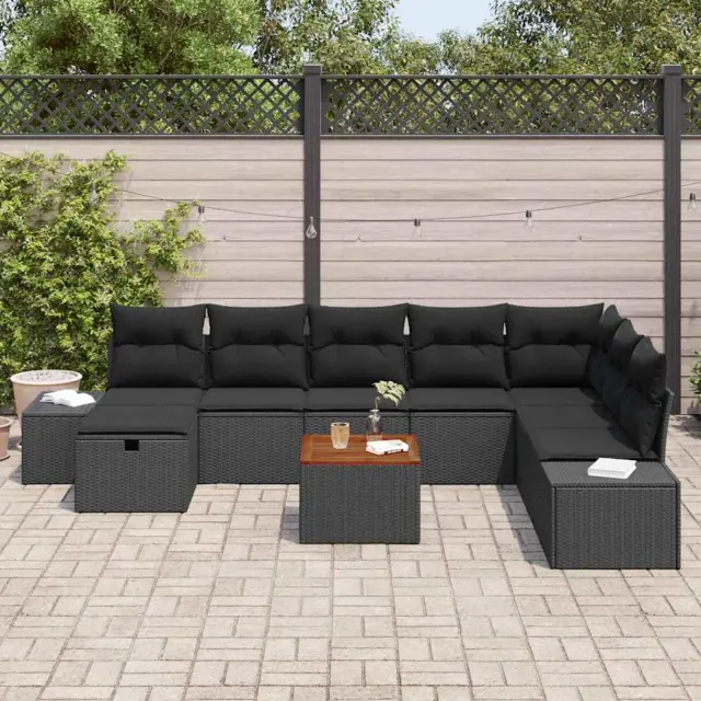 vidaXL Vrtna sedežna garnitura z blazino 9 pcs Črna poli ratan