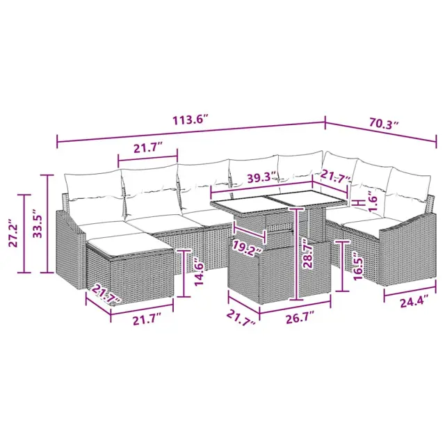 Ta vrtnarjev kavč s blazinami je vsestranski dragulj, ki prinaša sodoben zunanji slog in ponuja popolno mesto za sproščanje ali zabavo. S svojim pametnim dizajnom, čistimi linijami in priročnimi funkcionalnostmi, ta set spremeni vsak vrt ali teraso v moderen kotiček. Njegova elegantna pravokotna oblika in ročno tkane površine iz poliratana izgledajo fantastično in vabijo goste, da se usedejo in uživajo.