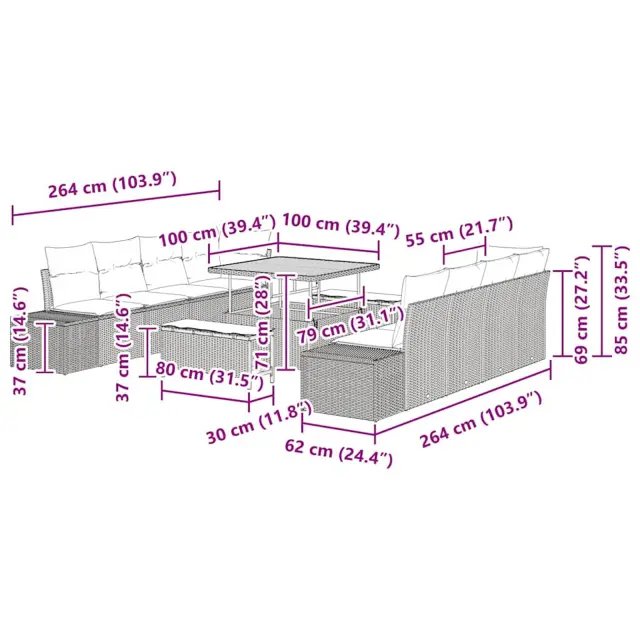 • Praktične rešitve za shranjevanje Garnitura ima skrite shranjevalne prostore, kar omogoča, da priročno shranite vse, kar potrebujete, od blazin do drugih dodatkov. Te shranjevalne možnosti v klopi in ottomanu ustvarjajo organiziran prostor in zagotavljajo brezskrbno uživanje na prostem.