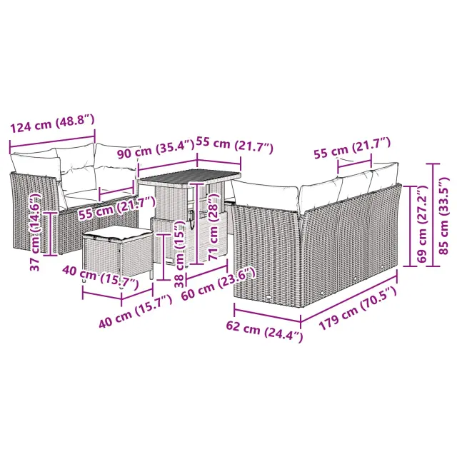 • Vključene komponente: Set vključuje udobno kavčno strukturo z mehko osebnimi blazinami in nastavljivimi poli ratan nasloni, kar nudi stilsko podporo. Miza iz trdnega akacijevega lesa dodaja še prostor za pijače in prigrizke.