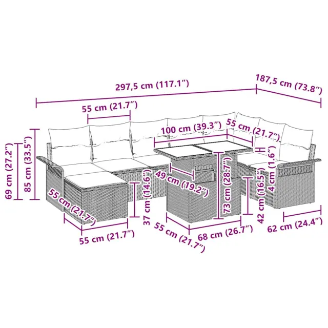 • Vključeni elementi: Set vključuje različne module, kot so kotni sedež, osrednji sedež, sedežna garnitura s podporo, tabure in mizo, vse zasnovano za udobje in enostavno postavitev. Kaljena steklena mizna površina je elegantna in gladka, super za postavljanje pijač ali dekoracij.