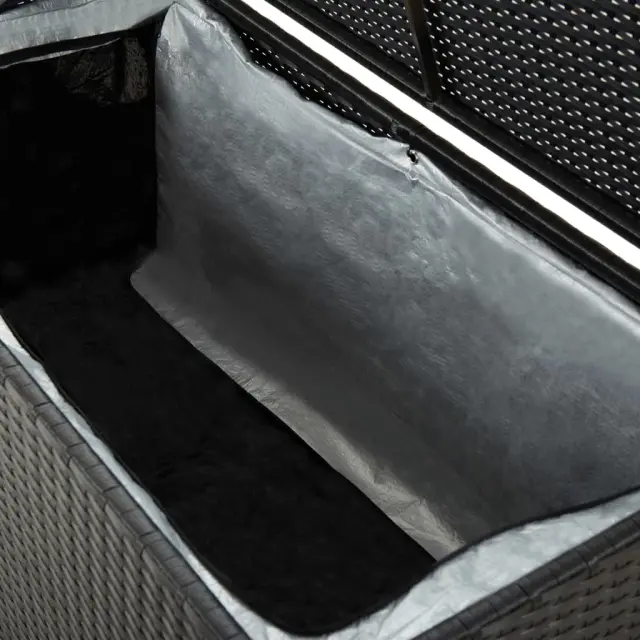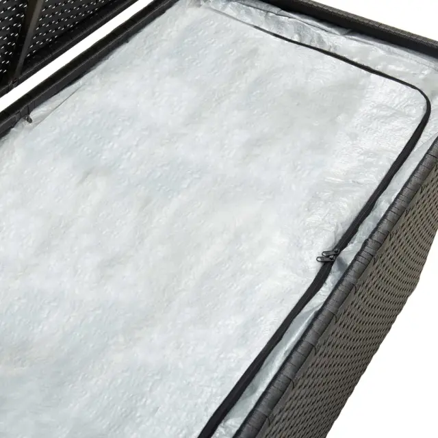 Zasnovana je z veliko prostora, zato je dovolj velika za shranjevanje vaših vrtnih stvari, kot so blazine za pohištvo, vzglavniki, dodatne odeje, igrače za bazen in pripomočki za vrtnarjenje. Ta škatla za shranjevanje je izdelana iz prašno premazanega jeklenega okvirja in ročno pletenega poli ratana, ki je vzdržljiv, trpežen in odporen na vremenske vplive za več let zanesljive uporabe. Podloga z zadrgo bo vsebino v škatli zaščitila pred prahom in vlago. Zahvaljujoč dvignjenim nogam ta škatla za shranjevanje zagotavlja dobro kroženje zraka pod njo ter ohranja vaše stvari suhe in čiste. Enostavno jo lahko obrišete z vlažno krpo.