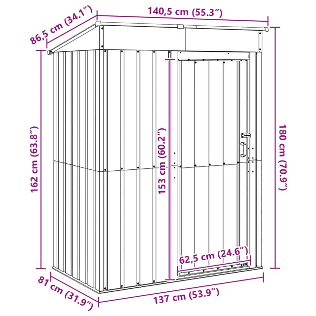Ta kovinska vrtna hiška je pravi primer funkcionalnega dizajna in modernih trendov, ki nudita trden prostor za shranjevanje vseh vaših zunanjih reči. Njena pravokotna oblika in elegantne linije se brez težav prilegajo kateremukoli vrtu ali terasi, hkrati pa nudijo prostor ne le za vrtnarska orodja, ampak tudi za dvig estetskega videza vašega zunanjega prostora s svojim modernim stilom.