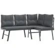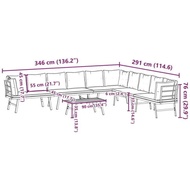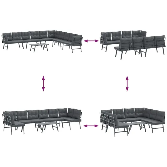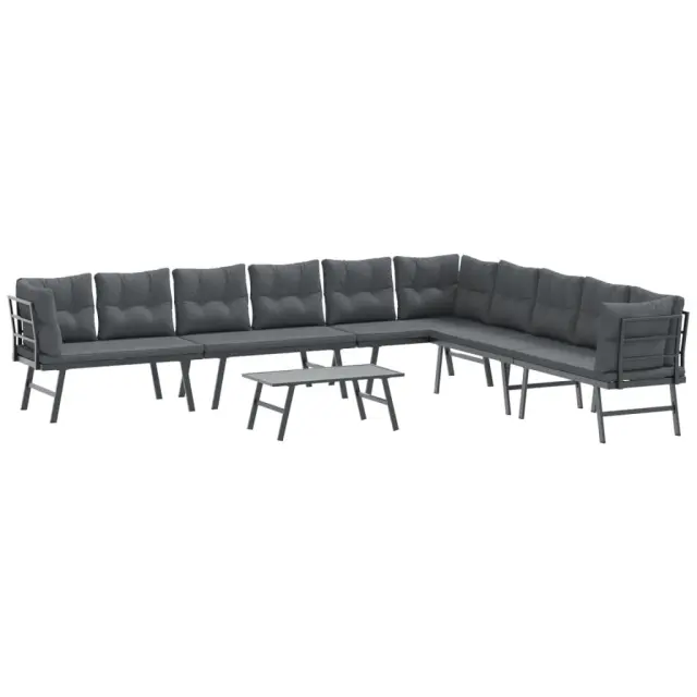 Ta komplet vrtnih klopi je popoln za uporabo na prostem. Postal bo osrednja točka vašega vrta, terase, dvorišča itd. Robusten in stabilen okvir: Jeklen okvir s prašnim premazom je močan, stabilen, trpežen ter odporen na korozijo in slabe vremenske razmere, kar zagotavlja dolgotrajno delovanje.Udoben dizajn: Rahlo ukrivljena naslonjala za hrbet zagotavljajo dodatno udobje pri sedenju na klopi.Udobno sedenje: To zunanje pohištvo z debelo podloženo blazino zagotavlja udobno sedenje.Močna površina: Robustna mizna plošča mizice za ob kavč je kot nalašč za postavitev pijače, hrane in drugih okrasnih predmetov.Moderna zasnova: Klubska mizica dodaja čar vašemu bivalnemu prostoru in se lepo poda k različnim slogom pohištva. Dobro je vedeti:Če želite, da vaše zunanje pohištvo ostane lepo, vam priporočamo, da ga zaščitite z vodoodporno prevleko.Potrebno sestavljanje: DaMiza:Barva: ČrnaMaterial: Jeklo s prašnim premazomDimenzije: 90 x 45 x 35 cm (D x Š x V)Vrtna klop:Barva: ČrnaMaterial: Jeklo s prašnim premazomCelotne dimenzije: 173 x 118 x 76 cm (Š x G x V)Dimenzije (3 naslonjala): 118 x 63 x 76 cm (Š x G x V)Dimenzije (2 naslonjali): 110 x 63 x 76 cm (Š x G x V)Velikost sedeža: 110 x 55 cm (Š x G)Višina sedeža od tal (brez blazine): 37 cmMaksimalna nosilnost (na sedež): 110 kgBlazina:Barva: AntracitnaMaterial prevleke: Tkanina (100 % poliester)Polnilo sedežne blazine: PenaPolnilo hrbtne blazine: PP bombažDimenzije sedežne blazine: 110 x 55 x 6 cm (Š x G x D)Dimenzije hrbtne blazine: 55 x 45 x 12 cm (Š x G x D)Paket vsebuje:1 x Miza4 x Vrtna klop4 x Sedežna blazina s snemljivo in pralno prevleko10 x Blazina za hrbet 3283712