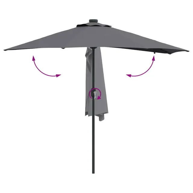 • Vključene komponente: Ta vrtni dežnik ima ročno vejo in zložljiv mehanizem za hitro odpiranje in enostavno shranjevanje. Ima tudi solarne LED luči na spodnji strani, ki ustvarjajo prijetno vzdušje med večernimi srečanji.