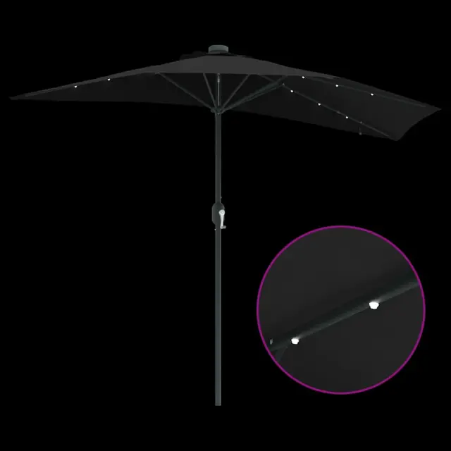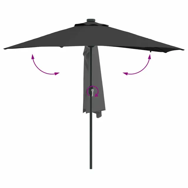 • Vključene komponente: Ta vrtni dežnik ima ročno vejo in zložljiv mehanizem za hitro odpiranje in enostavno shranjevanje. Ima tudi solarne LED luči na spodnji strani, ki ustvarjajo prijetno vzdušje med večernimi srečanji.