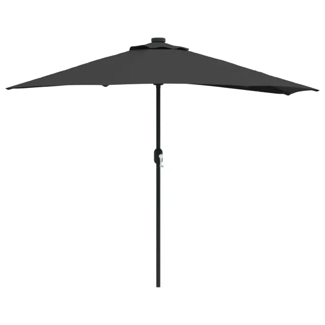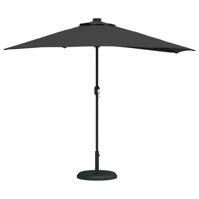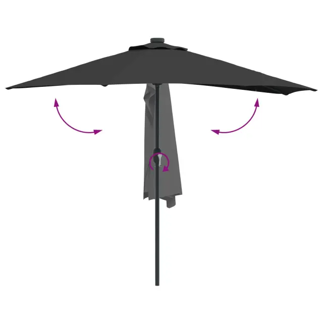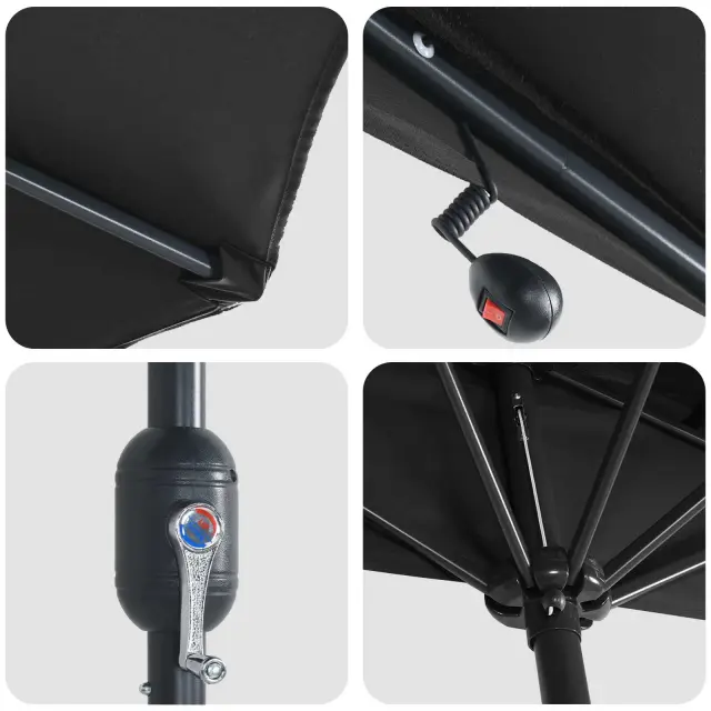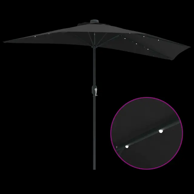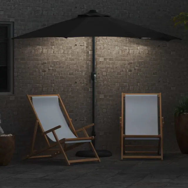 • LED osvetlitev: LED lučke so nameščene na spodnjem delu dežnika, kar ustvarja čarobno osvetljen večerni ambient. Te lučke bodo obogatile vaša večerna srečanja, saj ponujajo lepo osvetlitev, ki podaljšuje užitek na prostem tudi po mraku. In kar je najbolje, delujejo na solarno energijo.