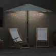 • Funkcije / Oblikovanje: Zložljiva zasnova olajša shranjevanje, ko dežnik ni v uporabi. Ročna veja omogoča enostavno odpiranje, kar povečuje udobnost. Solarne LED luči nudijo osvetlitev ponoči brez potrebe po električni energiji.