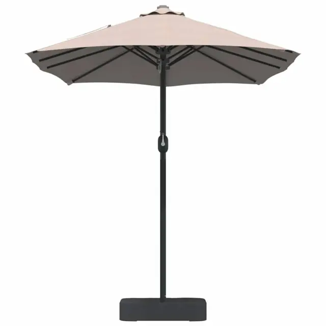 • Materiali: Ta dežnik je izdelan iz vrhunskega poliestra in jekla, kar ga naredi odlično zaščitenega pred vremenskimi vplivi. Poliesterska streha nudi UV zaščito, kar pomeni, da se ne bledi in lepo drži kar nekaj časa. Že robusten jekleni okvir mu daje stabilnost tudi v močnem vetru. Skupaj ti materiali ustvarjajo zanesljivo in stilsko rešitev za zunanjo senco.