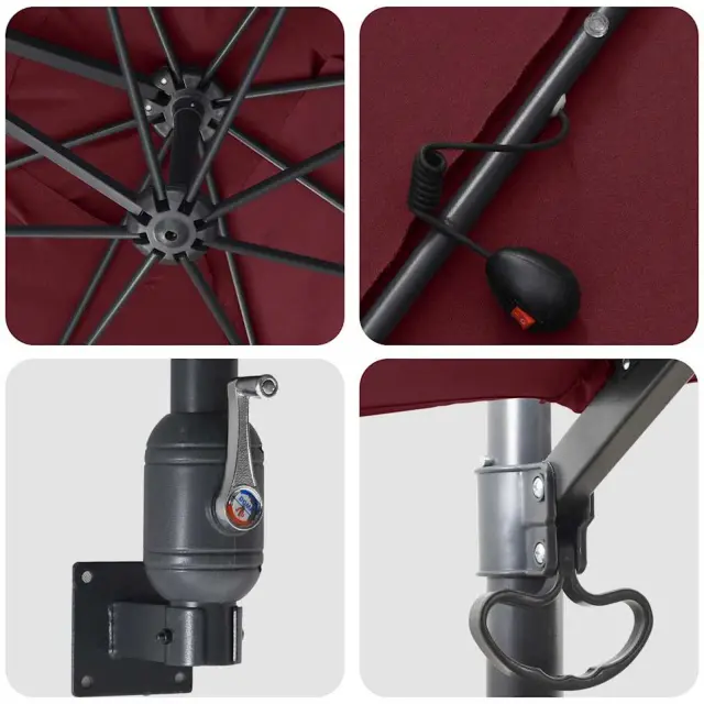 • LED osvetlitev Osvetli svoje zunanje večere s priloženimi LED trakovi pod dežnikom. Ti napeljujo se s sončno energijo ali baterijami in ustvarjajo toplo vzdušje, kar ti omogoča daljše uživanje na prostem ob čudoviti svetlobi in boljšem vidu.