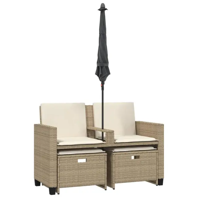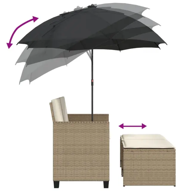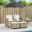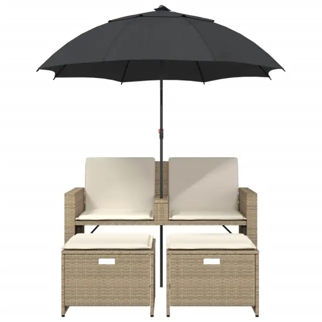 vidaXL Vrtni kavč dvosed s senčnikom in stolčki bež poli ratan