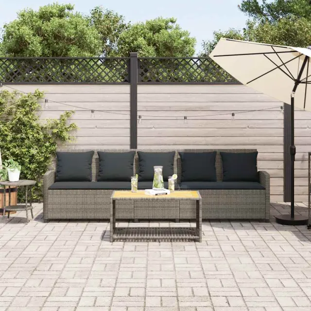 Sprostite se in uživajte na prostem v tem udobnem 5-sedežnem vrtnem kavču! Trpežen material: PE ratan, znan tudi kot poli ratan, je močan sintetični material, ki ne potrebuje vzdrževanja in je videti kot naravni ratan. Je lahek, enostaven za čiščenje in se zaradi svoje vzdržljivosti in odpornosti na vremenske vplive pogosto uporablja za zunanje pohištvo.Udobno sedenje: To zunanje pohištvo z debelo oblazinjenimi blazinami zagotavlja udobno sedenje.Prevleko je mogoče odstraniti in oprati: Te sedežne blazine in vzglavniki imajo odstranljive prevleke za lažje pranje in vzdrževanje.Robusten in stabilen okvir: Prašno barvan jekleni okvir zagotavlja, da je vrtno pohištvo močno in stabilno za vsakodnevno uporabo na prostem. Dobro je vedeti:Če želite, da vaše zunanje pohištvo ostane lepo, vam priporočamo, da ga zaščitite z vodoodporno prevleko.Maks. nosilnost (na sedež): 110 kgUV-odpornoPotrebno sestavljanje: Da5-sedežni vrtni kavč:Barva: SivaMaterial: PE ratan, jeklen okvir s prašnim premazomCelotne mere: 280 x 68,5 x 87,5 cm (Š x G x V)Širina sedeža: 267 cmGlobina sedeža: 57 cmVišina sedeža od tal (brez blazine): 43 cmVišina naslonjala za roke, merjena od tal: 61 cmBlazina:Barva: Temno sivaMaterial prevleke: Tkanina (100 % poliester)Material za polnjenje hrbtne blazine Material: vlakna PPPolnilo sedežne blazine: PenaDimenzije sedežne blazine (L): 106 x 57 x 3 cm (Š x G x D)Dimenzije sedežne blazine (S): 55 x 57 x 3 cm (Š x G x D)Dimenzije blazine za hrbet: 53 x 43 x 12 cm (D x Š x D)Paket vsebuje:1 x 5-sedežni vrtni kavč2 x sedežna blazina s snemljivo in pralno prevleko (L)1 x sedežna blazina s snemljivo in pralno prevleko (S)5 x Hrbtna blazina s snemljivo in pralno prevleko 4104114