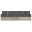 Sprostite se in uživajte na prostem v tem udobnem 5-sedežnem vrtnem kavču! Trpežen material: PE ratan, znan tudi kot poli ratan, je močan sintetični material, ki ne potrebuje vzdrževanja in je videti kot naravni ratan. Je lahek, enostaven za čiščenje in se zaradi svoje vzdržljivosti in odpornosti na vremenske vplive pogosto uporablja za zunanje pohištvo.Udobno sedenje: To zunanje pohištvo z debelo oblazinjenimi blazinami zagotavlja udobno sedenje.Prevleko je mogoče odstraniti in oprati: Te sedežne blazine in vzglavniki imajo odstranljive prevleke za lažje pranje in vzdrževanje.Robusten in stabilen okvir: Prašno barvan jekleni okvir zagotavlja, da je vrtno pohištvo močno in stabilno za vsakodnevno uporabo na prostem. Dobro je vedeti:Če želite, da vaše zunanje pohištvo ostane lepo, vam priporočamo, da ga zaščitite z vodoodporno prevleko.Maks. nosilnost (na sedež): 110 kgUV-odpornoPotrebno sestavljanje: Da5-sedežni vrtni kavč:Barva: Svetlo sivaMaterial: PE ratan, jeklen okvir s prašnim premazomCelotne mere: 280 x 68,5 x 87,5 cm (Š x G x V)Širina sedeža: 267 cmGlobina sedeža: 57 cmVišina sedeža od tal (brez blazine): 43 cmVišina naslonjala za roke, merjena od tal: 61 cmBlazina:Barva: Temno sivaMaterial prevleke: Tkanina (100 % poliester)Material za polnjenje hrbtne blazine Material: vlakna PPPolnilo sedežne blazine: PenaDimenzije sedežne blazine (L): 106 x 57 x 3 cm (Š x G x D)Dimenzije sedežne blazine (S): 55 x 57 x 3 cm (Š x G x D)Dimenzije blazine za hrbet: 53 x 43 x 12 cm (D x Š x D)Paket vsebuje:1 x 5-sedežni vrtni kavč2 x sedežna blazina s snemljivo in pralno prevleko (L)1 x sedežna blazina s snemljivo in pralno prevleko (S)5 x Hrbtna blazina s snemljivo in pralno prevleko 4104117