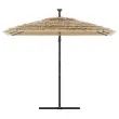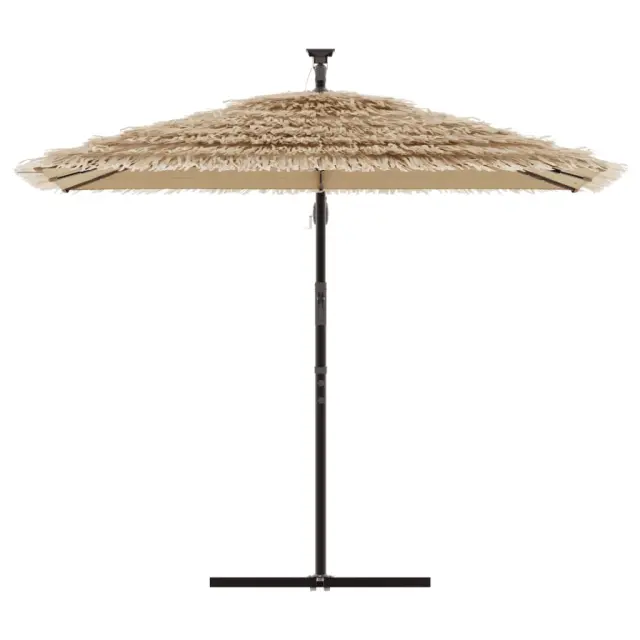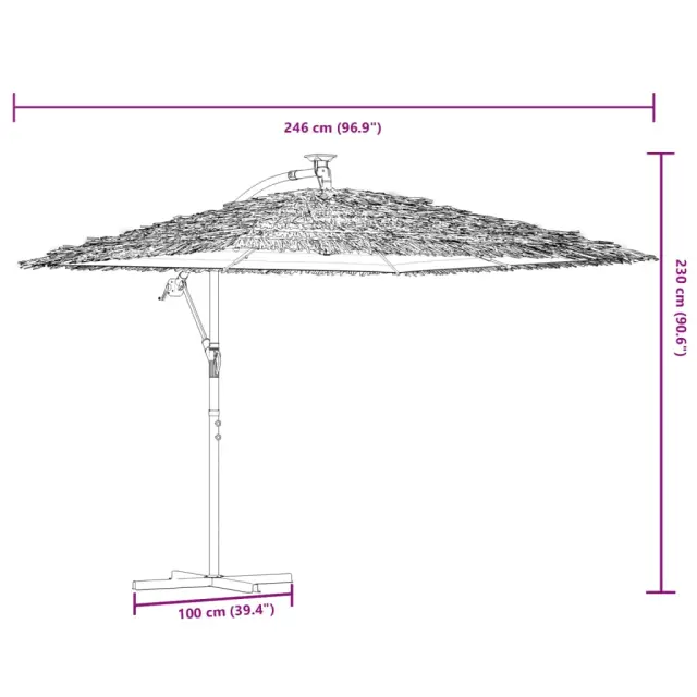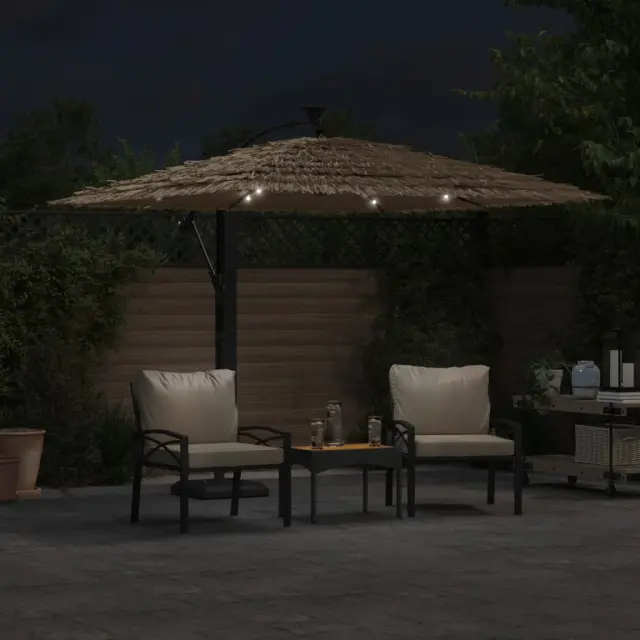 Ta vrtni senčnik z LED je popoln za zagotavljanje sence in zaščito pred škodljivimi UV žarki. Zaščita pred soncem in dežjem: Ta zunanji senčnik, izdelan iz trpežnega poliestra, nudi zaščito pred soncem in dežjem ter tako ustvarja idealno mesto za uživanje na prostem.Robustna konstrukcija: Ta vrtni senčnik je podprt z robustnim drogom in rebri na vrhu, kar zagotavlja, da prevleka ostane pokonci tudi v vetrovnih dneh.Mehanizem z ročico: Zahvaljujoč ročici se senčnik enostavno odpre in zapre.Svetle LED luči: Vgrajene LED luči senčnika osvetlijo vaš zunanji bivalni prostor ter ustvarijo prijeten in romantičen ambient, ko sonce zaide. Dobro je vedeti:Ta izdelek ni igrača! Poskrbite, da otroci senčnika, nadstreška ali podstavka ne bodo uporabljali za igro ali plezanje.Ne uporabljajte odprtega ognja (npr. vrtni žar ali žar) pod tem izdelkom ali tik ob njem.Ta izdelek ni 100 % vodotesen. Priporočamo, da izdelek zaščitite z vodoodpornim razpršilom za boljšo vodoodpornost.Barva: RjavaMaterial: Blago (100 % poliester), jeklo, slamaDimenzije: 246 x 246 x 230 cm (D x Š x V)Premer droga: 48 mmVelikost križne osnove: 100 x 100 cm (D x Š)Z ročičnim sistemom8-slojna slamnata površina3 LED luči na vsakem rebruPotrebno sestavljanje: Da 4005086