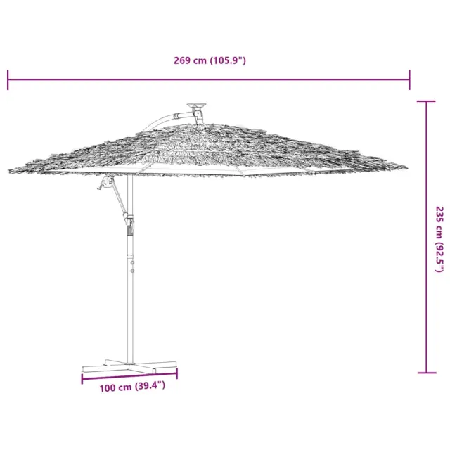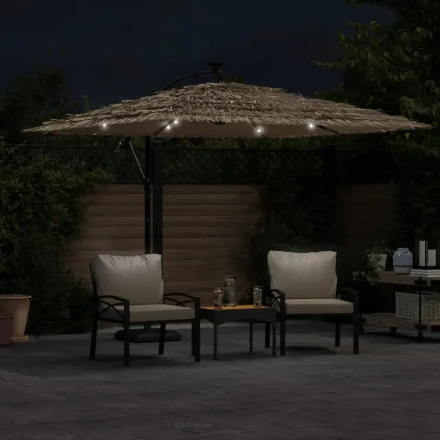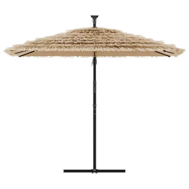 Ta vrtni senčnik z LED je popoln za zagotavljanje sence in zaščito pred škodljivimi UV žarki. Zaščita pred soncem in dežjem: Ta zunanji senčnik, izdelan iz trpežnega poliestra, nudi zaščito pred soncem in dežjem ter tako ustvarja idealno mesto za uživanje na prostem.Robustna konstrukcija: Ta vrtni senčnik je podprt z robustnim drogom in rebri na vrhu, kar zagotavlja, da prevleka ostane pokonci tudi v vetrovnih dneh.Mehanizem z ročico: Zahvaljujoč ročici se senčnik enostavno odpre in zapre.Svetle LED luči: Vgrajene LED luči senčnika osvetlijo vaš zunanji bivalni prostor ter ustvarijo prijeten in romantičen ambient, ko sonce zaide. Dobro je vedeti:Ta izdelek ni igrača! Poskrbite, da otroci senčnika, nadstreška ali podstavka ne bodo uporabljali za igro ali plezanje.Ne uporabljajte odprtega ognja (npr. vrtni žar ali žar) pod tem izdelkom ali tik ob njem.Ta izdelek ni 100 % vodotesen. Priporočamo, da izdelek zaščitite z vodoodpornim razpršilom za boljšo vodoodpornost.Barva: RjavaMaterial: Blago (100 % poliester), jeklo, slamaDimenzije: 269 x 269 x 235 cm (D x Š x V)Premer droga: 48 mmVelikost križne osnove: 100 x 100 cm (D x Š)Z ročičnim sistemom6-slojna slamnata površina3 LED luči na vsakem rebruPotrebno sestavljanje: Da 4005087