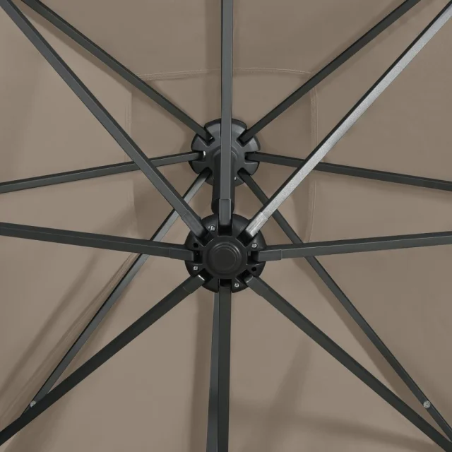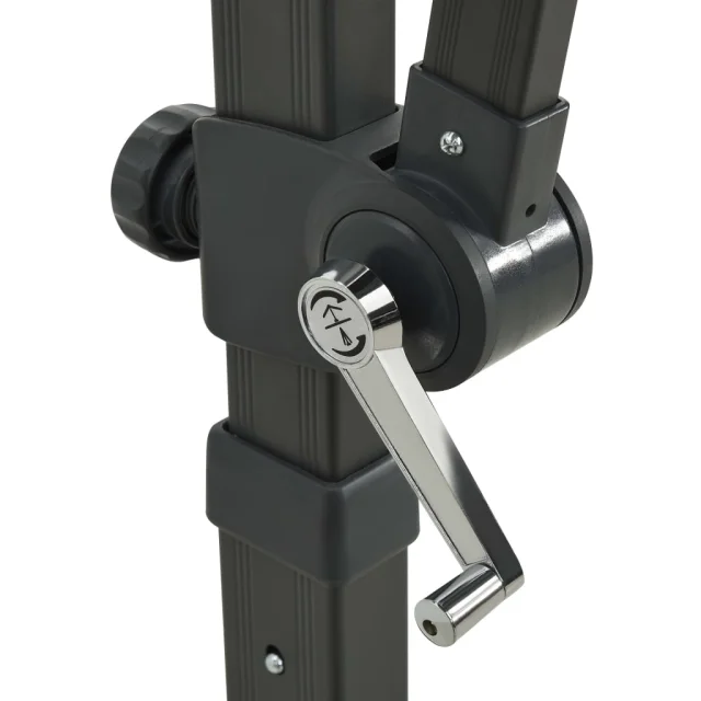 Prevleka za senčnik iz UV obstojnega in nebledljivega poliestra zagotavlja optimalno zaščito pred soncem ter je preprosta za čiščenje. Ima močan križni podstavek za dodatno stabilnost. Izjemna oblika vrtnega senčnika omogoča nagibanje in vrtenje za 360 stopinj, da si boste lahko zagotovili zaščito pred soncem pod katerim koli kotom. Močan aluminijast drog v kombinaciji z 8 rebrami zagotavlja stabilnost in vzdržljivost senčnika. Ta vrtni senčnik lahko preprosto odpirate in zapirate s pomočjo ročičnega mehanizma. Senčnik ima tudi 24 LED lučk za osvetlitev vašega zunanjega bivalnega prostora in ustvarjanje prijetnega romantičnega vzdušja, ko zaide sonce.