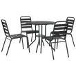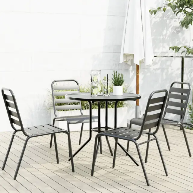 Ta komplet vrtnih stolov z elegantnim videzom je izjemen dodatek k vašemu trenutnemu zunanjemu in notranjemu bivalnemu prostoru. Prašno barvano jeklo: Ta vrtna barska garnitura je izdelana iz prašno barvanega jekla, ki je izredno trd in močan material. Ponuja trdnost in stabilnost. Prašni premaz na površini jekla ustvari zaščitno plast pred rjo, korozijo in obrabo.Udobno sedenje: Zunanji stol s sedežem iz letvic in ukrivljenim naslonjalom hrbet se prilega vašemu telesu.Zložljiva funkcija: Stole lahko zložite enega na drugega in tako prihranite prostor.Mizna plošča iz mreže: Mrežasta mizna plošča ima čudovite vzorce in je primerna za odlaganje pijače, hrane in drugih potrebščin.Široka uporaba: Ta večnamenski set zunanjih stolov ima popolno obliko, ki se prilega vsakemu okolju v vaši hiši. Uporabljajo se lahko v kuhinji, jedilnici, dnevni sobi, na terasi itd.Potrebno sestavljanje: DaStol:Barva: AntracitnaMaterial okvirja: Prašno barvano jeklo z elektroforezno obdelavoDimenzije: 42 x 63 x 84 cm (Š x G x V)Širina sedeža: 42 cmGlobina sedeža: 34,5 cmVišina sedeža, merjena od tal: 42 cmLetven dizajnOdporno na vremenske vplive in rjoNajvečja nosilnost (na sedež): 110 kgPriložena blazina: NeMiza:Barva: AntracitnaMaterial okvirja: Prašno barvano jeklo z elektroforezno obdelavoMaterial vijaka: Nerjaveče jekloMaterial opreme: Pocinkano jekloDimenzije mize: 80 x 72,5 cm (premer x V)Paket vsebuje:4 x Vrtni stol1 x Miza 3283765