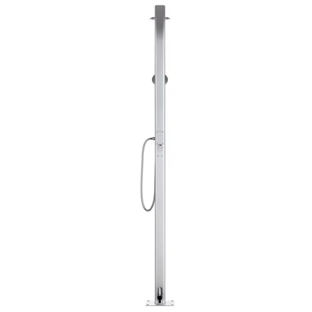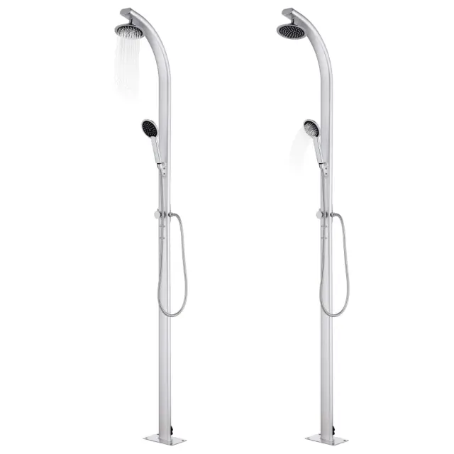 Ta vrtni tuš z modernim dizajnom bo odličen dodatek za vaš bazen in druge zunanje bivalne prostore. Ta vrtni tuš je izdelan iz aluminija, zato je vremensko odporen. Tuš sistem ima tuš glavo in ročni tuš za potrebe vrtnarjenja, zalivanja in hitrega tuširanja. Ročni tuš ima fleksibilno cev z dvojnim zaklepom z dolžino 1,5 m. Ima tudi držalo za ročni tuš, ki se lahko uporablja za odlaganje brisače. Vzdržljiv in na korozijo odporen podstavek za tuš je izdelan iz vrhuskega WPC-ja ter ima okvir iz nerjavečega brušenega jekla, ki zagotavlja vzdržljivost za dolgoletno uporabo. Nudi najvišji nivo higiene, zato je popoln za uporabo na prostem. Zahvaljujoč trdnosti in vsestranskosti lahko ta podstavek za tuš služi tudi kot postavek za bazensko lestev. Potopite se v resnično sproščujoče tuširanje in uživajte v sodobnem stilu tega zunanjega tuš sistema!Barva osnove: SivaMaterial: Aluminij, nerjaveče jeklo, WPCCelotna višina: 220 cmPremer tuš glave: 15 cmDolžina ročnega tuša: 1,5 mDimenzije podstavka: 110 x 62 x 5 cm (D x Š x D)Podstavek za 2 osebiGumb iz kroma in cinkaIzvrtane luknje za pritrditevPaket vsebuje plastične pripomočke za namestitev 3070796