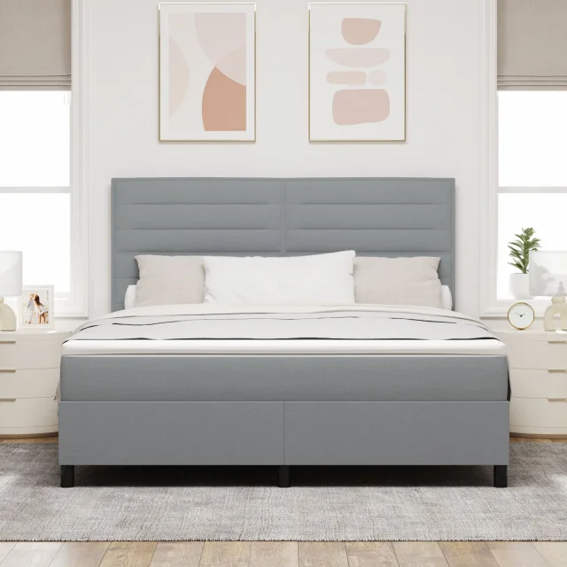 Ta vzmetna postelja res odlično združuje eleganco in praktičnost, kar jo dela super izbiro za spanje v tvoji prostorni spalnici. Z svetlo sivo tkanino in trdnimi lesenimi nogami izboljšuje tako izgled kot udobje.