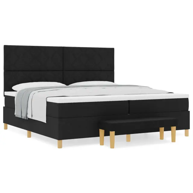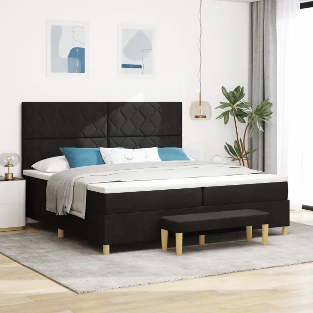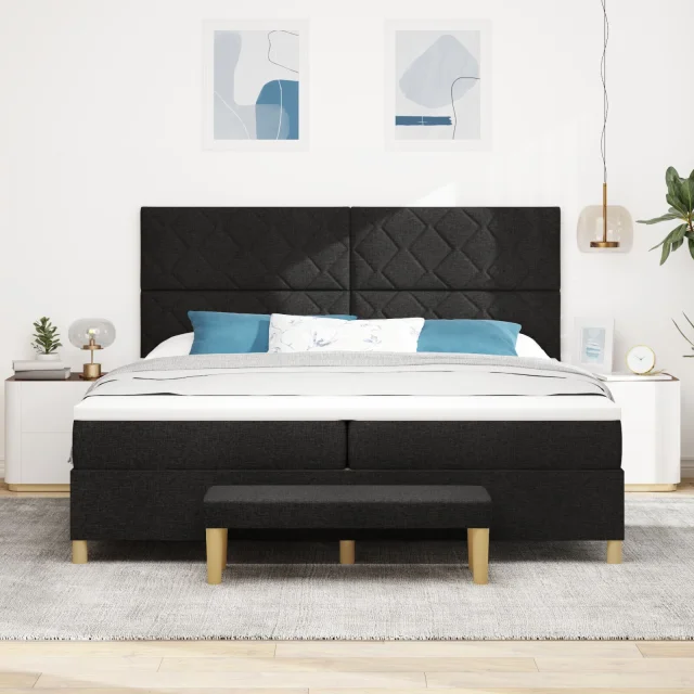 Ta vzmetnična postelja združuje udobje in dober izgled, kar jo dela super izbiro za vsakogar, ki želi popestriti svojo spalnico. S svojo trendovsko mat črno oblazinjenostjo in močnim lesenim okvirjem, ni samo postelja, ampak tudi element, ki doda eleganco in mir v vsak prostor, saj je primerna za dva odrasla.