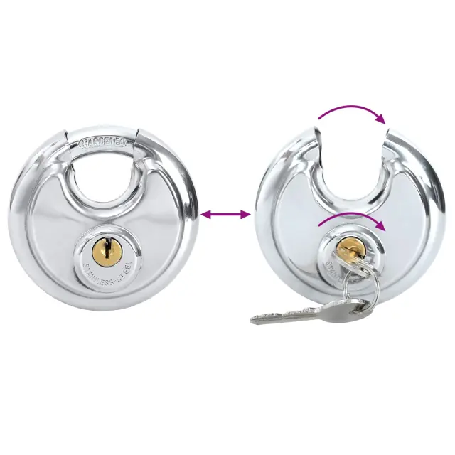 Ta trpežna discus ključavnica prihaja v setu dveh, super je za varnost pri različnih namerah. Zelo je posebna po svoji krožni obliki in prehodnem stilu, zato se brez težav ujema s sodobno in tradicionalno estetiko, kar jo naredu idealno za različna okolja, doma, v pisarni ali zunaj. Njena močna konstrukcija iz nerjavečega jekla ni le zanesljiva, ampak daje tudi eleganten, poliran videz. Idealne so za tiste, ki si želijo varno zaščito za svoje stvari, saj prinašajo mir s pridihom elegance.