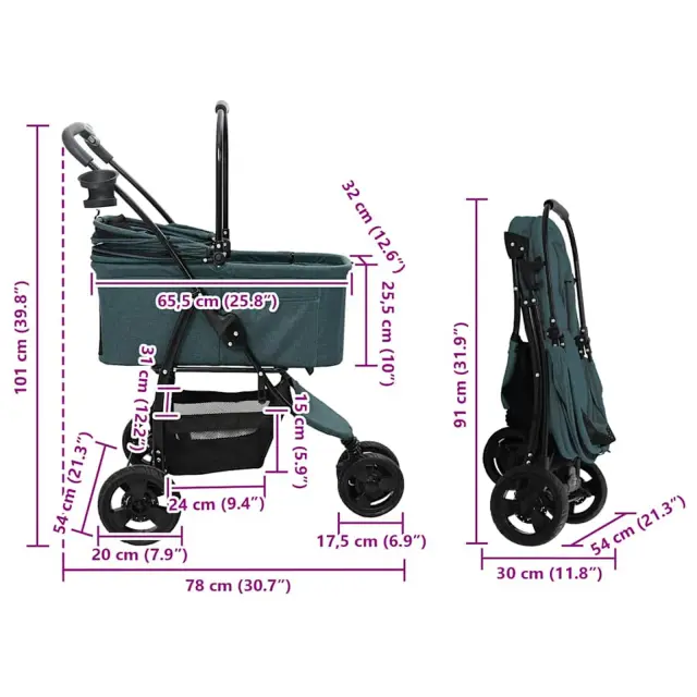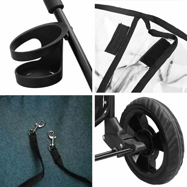 • Vključene komponente: Voziček za hišne ljubljenčke je nabit z uporabnimi funkcijami, vključno s stranskimi žepki za hiter dostop do potrebščin in spodnjim prostorom za shranjevanje. Ima tudi nogo-aktivirano zaklepanje ter vrtljiva prednja kolesa, ki omogočajo stabilno in varno vožnjo na različnih terenih.