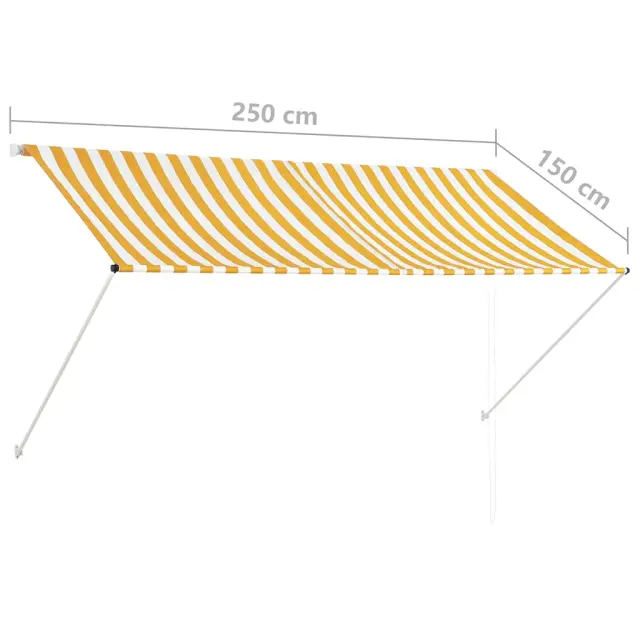 Ta zložljiva tenda bo zagotovo idealna za uporabo pred oknom, na terasi, balkonu ali na vašem vrtu. Na vodo, UV in vremenske vplive odporna tenda je izdelana iz visokokakovostnega blaga s PA oblogo. Močan jeklen okvir zagotavlja, da je tenda močna in trpežna. Streha iz poliestra je preprosta za čiščenje, saj jo lahko snamete in operete. Poleg tega se izdelek lahko uporablja kot običajno senčilo ali pa za popolno pokritje okna. Zahvaljujoč podporni ročici in verigi je ta tenda zložljiva. Višina in kot tende sta prilagodljiva. Izdelek je preprost za montažo.Barva: Rumena in belaMaterial: Jeklen okvir in 100 % poliestrsko blago s PA oblogoTeža materiala: 180 g/㎡Velikost: 250 x 150 cm (Š x V)Dolžina: 0 - 150 cmRočno upravljanjeOdporno na UV žarke in vodo 143754