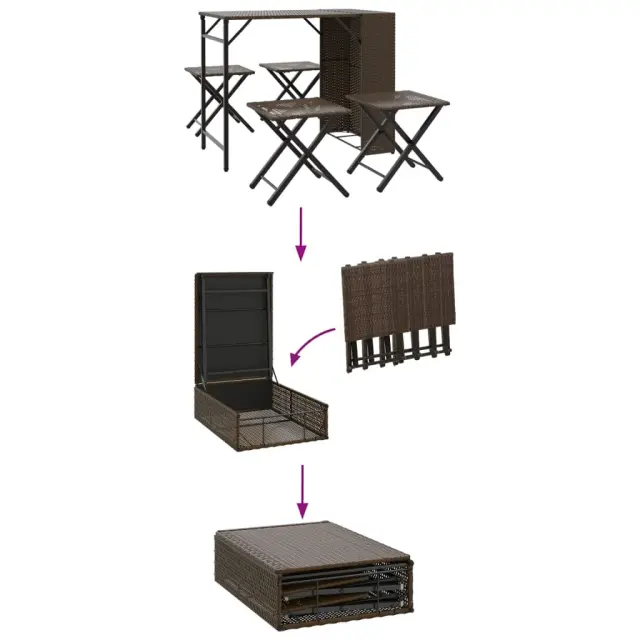 Ta vrtni jedilni set je odlična izbira, ki jo lahko vzamete s seboj med kampiranjem ali se preprosto sprostite na vrtu, dvorišču ali terasi. Vzdržljiv material: PE ratan, znan tudi kot poli ratan, je močan sintetični material, ki zahteva malo vzdrževanja in je videti kot naravni ratan. Je lahek, enostaven za čiščenje in se zaradi svoje vzdržljivosti in odpornosti na vremenske vplive pogosto uporablja za zunanje pohištvo.Kompaktno shranjevanje: Mizo in stole je mogoče zložiti za enostavno shranjevanje in prevoz. Poleg tega je mogoče stole shraniti tudi v mizo, s čimer se še dodatno poveča prostorska učinkovitost.Robusten in stabilen okvir: Prašno barvan jekleni okvir zagotavlja, da je vrtno pohištvo močno in stabilno za vsakodnevno uporabo na prostem. Dobro je vedeti:Če želite, da vaše zunanje pohištvo ostane lepo, vam priporočamo, da ga zaščitite z vodoodporno prevleko.Barva: RjavaMaterial: PE ratan, jeklen okvir s prašnim premazomDimenzije mizice (postavljena): 90 x 55 x 73 cm (D x Š x V)Dimenzije mize (zložena): 72,5 x 55 x 21 cm (D x Š x V)Dimenzije stolčka (postavljena): 35 x 35 x 49 cm (Š x G x V)Dimenzije stolčka (zložena): 35 x 51 x 7 cm (Š x G x V)Maksimalna nosilnost (na sedež): 110 kgZložljivoPotrebno sestavljanje: DaPaket vsebuje:1 x Miza4 x Stolček 365945