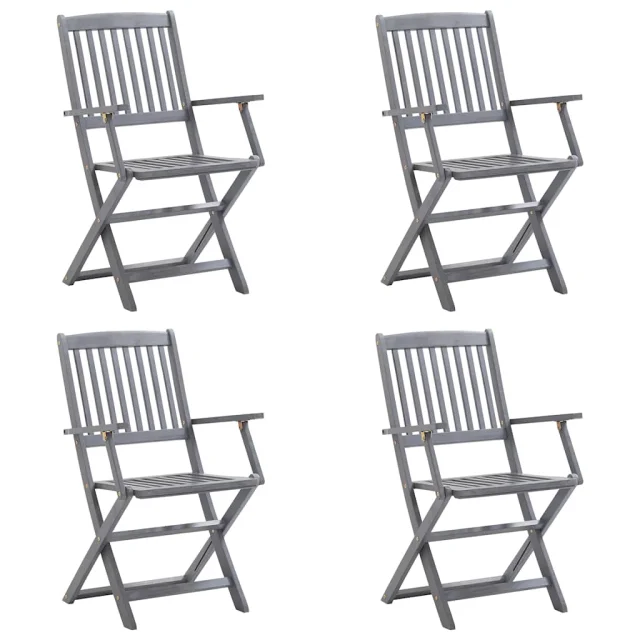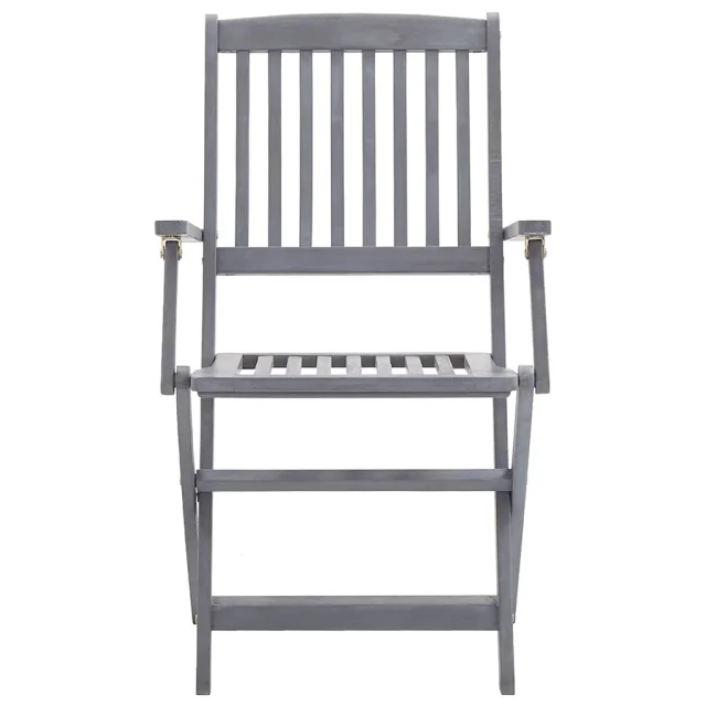 Ti jedilni stoli so izdelani iz trdnega akacijevega lesa, tropskega trdega lesa, ki zagotavlja vodoodpornost in dolgotrajno vzdržljivost. Trden akacijev les je dovolj močan za prenašanje teže ter se dobro spopada z obrabo in uporabo. Siva sprana površina je preprosta za čiščenje z vlažno krpo. Stole lahko zložite in tako prihranite prostor, ko niso v uporabi. Priložene blazine zagotavljajo dodatno udobje med počivanjem ali večerjanjem. Vsaka blazina ima dva kompleta vrvic za dobro pritrditev na stol.