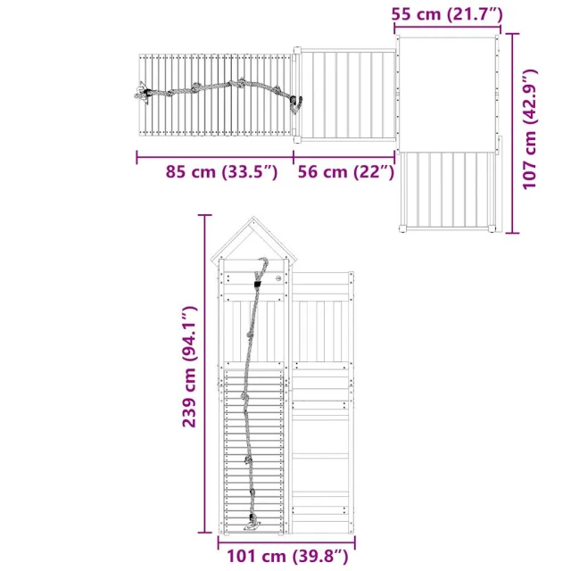 • Premišljena zasnova: Obdajajoče lesene ograje so zasnovane tako, da zagotavljajo varnost otrok med njihovo veselo igro. Poleg tega streha zagotavlja senco za vaše otroke v vročih poletnih dneh.