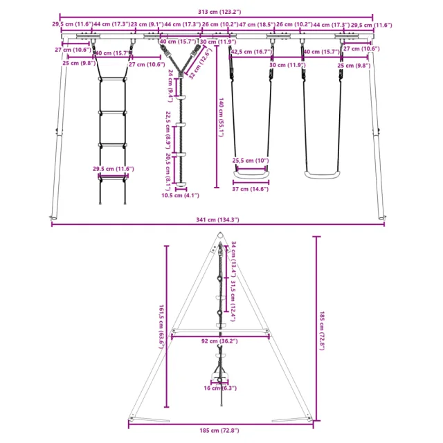 • Zabaven center za dejavnosti: Ta otroška gugalnica ponuja 3 različne možnosti igranja - dva gugalna sedeža, gugalnico s stopničkami in plezalno lestev. Tako se lahko otroci gugajo in plezajo po svojih željah.