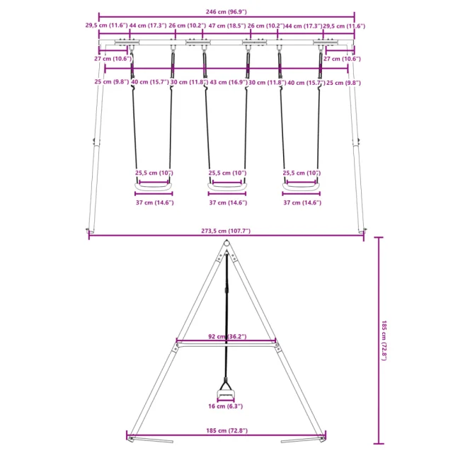 • Kovinski okvir za velike obremenitve: Ta okvir za gugalnico je izdelan iz barvanih jeklenih cevi, ki so odporne proti rjavenju, izjemno trdne in odporne na deformacije, kar zagotavlja odlično stabilnost in vzdržljivost. Struktura v obliki črke A zagotavlja močno oporo brez nihanja.