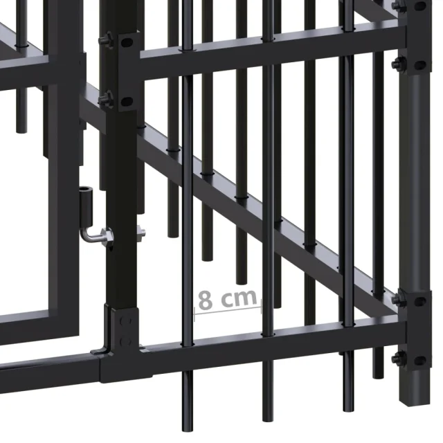Ta pasji boks zagotavlja dovolj prostora za gibanje. Stene iz jeklenih palic preprečujejo neubogljivost in nesreče ter zagotavljajo dobro prezračevanje. Zahvaljujoč čvrsti jekleni konstrukciji s prašnim premazom je ta pasji boks vzdržljiv in izdelan za dolgoletno uporabo. Vrata s tečaji imajo sistem zapiranja z zapahom, ki bo vašim psom zagotovil dodatno varnost.