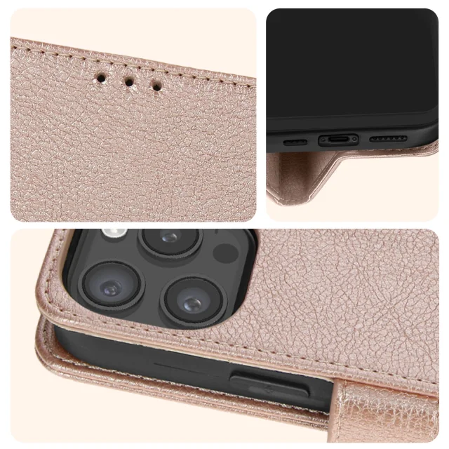 Ovitek za iPhone 15 Pro serije Chesterfield roza. Ta prevleka ima denarnico, vgrajeno v podlogo zavihka. Služi tudi kot video podpora. Integriran je magnetni jezicek.