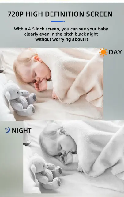 Infrardeči nočni vid: Kamera je opremljena z nočnim vidom, da lahko jasno spremlja in reproducira situacijo tudi v temi. S tem video monitorjem lahko spremljate tako otroško sobo in se počutite varne.