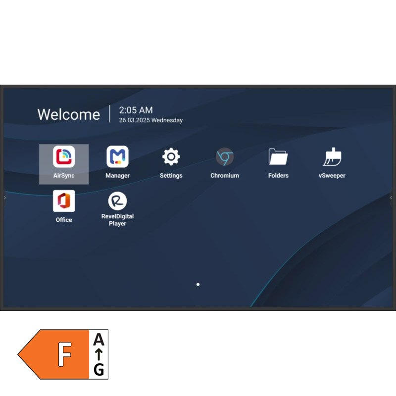 Za neprekinjeno delovanje je zaslon opremljen s funkcijo samodejnega failoverja, ki ob izgubi signala na primarnem vhodu samodejno preklopi na naslednji razpoložljivi vir, kot so HDMI, USB-C ali OPS modul. Poleg tega omogoča predvajanje vsebin neposredno z USB-ja, skupaj z možnostjo razporejanja in samodejnega zagona, kar poenostavi digitalno obveščanje brez potrebe po računalniku. Povezljivost je prilagodljiva: USB-C omogoča prenos slike, podatkov, omrežja in hkrati 65W polnjenje preko enega kabla, HDMI 2.1 vhod in 2.0 izhod pa omogočata podvajanje slike ali povezavo do devetih zaslonov. Brezžično deljenje vsebin je možno prek AirSync, ki podpira AirPlay, Miracast in Chromecast, ter omogoča hitro in varno deljenje zaslona brez dodatne programske opreme.