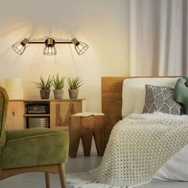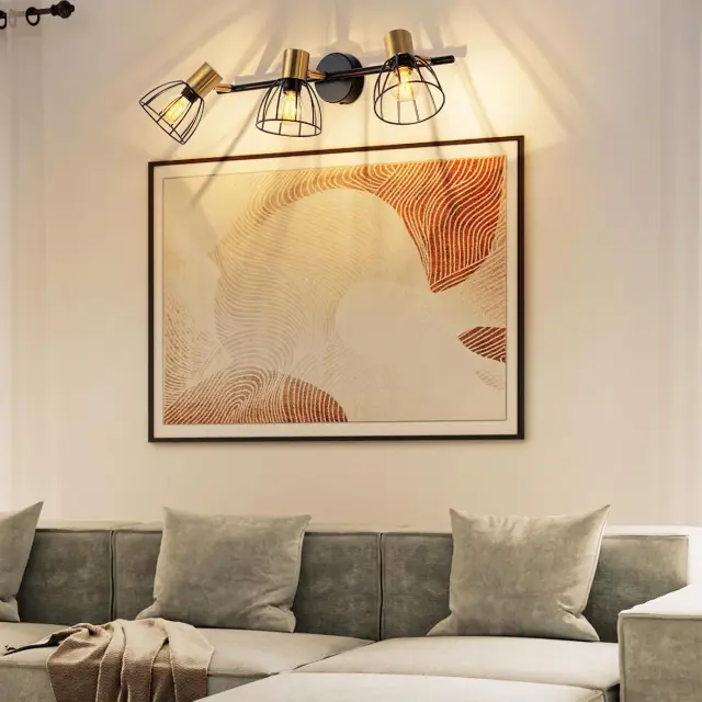 Retro dizajn: Ta stenska stenska svetilka ima industrijsko zasnovo s kletko iz kovanega železa. Črni kovinski okvir se kombinira z medeninastimi nosilci svetilk, kar ustvarja vizualni kontrast med vintage videzom in diskretnim razkošjem. Njene čiste linije oddajajo močan industrijski značaj. Nameščena v vhodnem prostoru ali hodniku, postane pravi osrednji element sobe.
