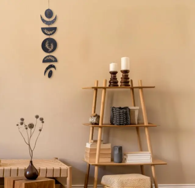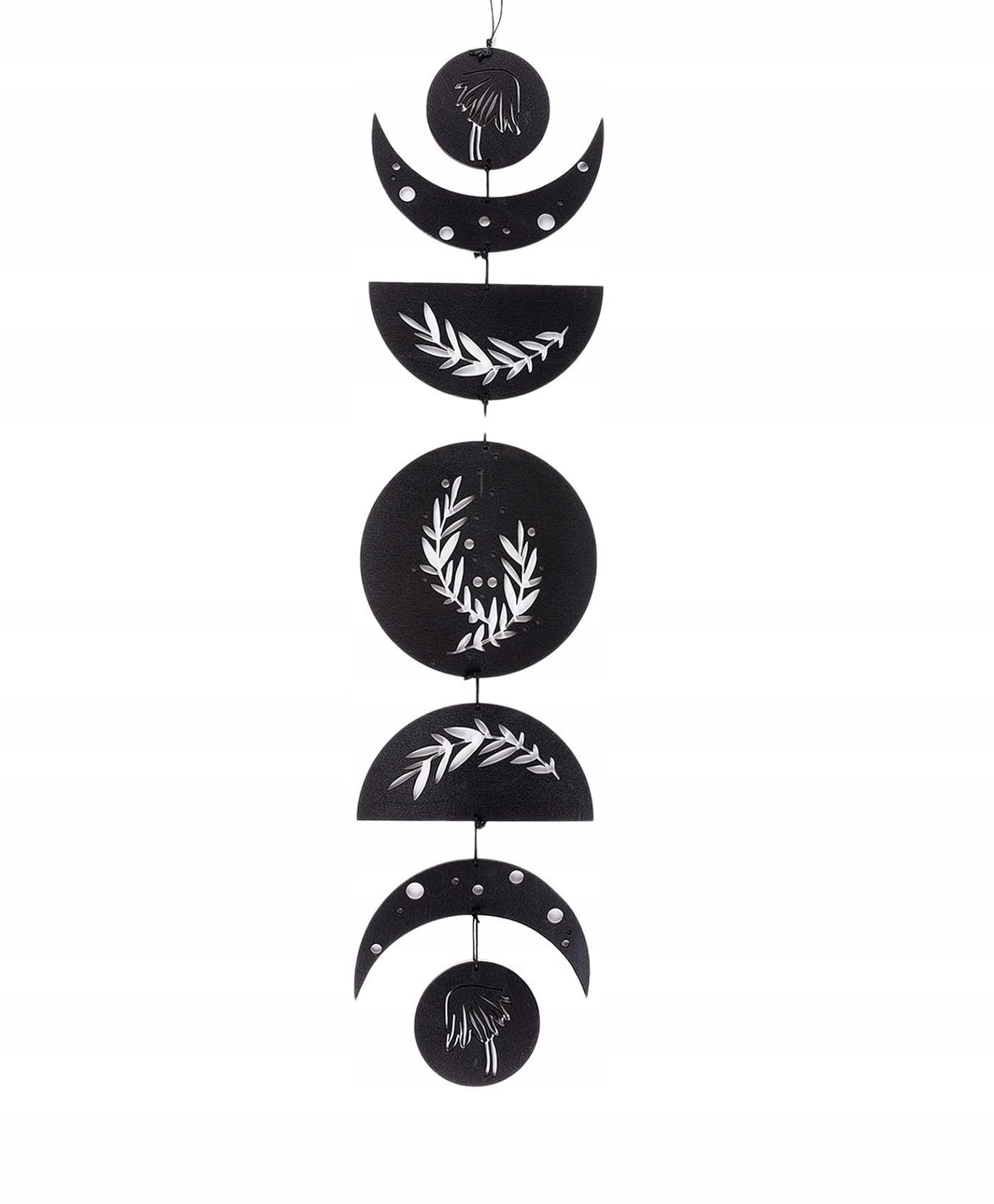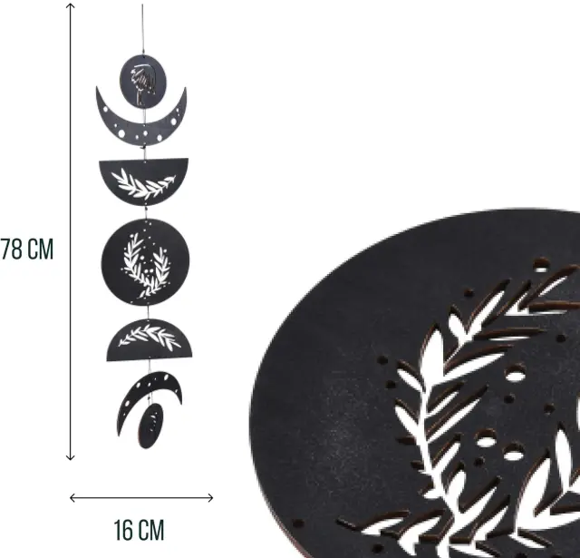 V svoj dom prinesite magijo vesolja z ročno izdelano stensko girlando Happilax z luninimi menami. Ta edinstvena dekoracija je sestavljena iz sedmih skrbno izdelanih elementov, ki predstavljajo vsako fazo lune v elegantni obliki. Izdelana je iz visokokakovostnega lesa in premazana s črnim zaključkom, zato se popolnoma poda k boho slogu in ustvari harmoničen poudarek v vsakem prostoru. Girlanda je idealna za spalnico, dnevno sobo, pisarno ali prostore za meditacijo, kjer ustvarja sproščeno in prijetno vzdušje.