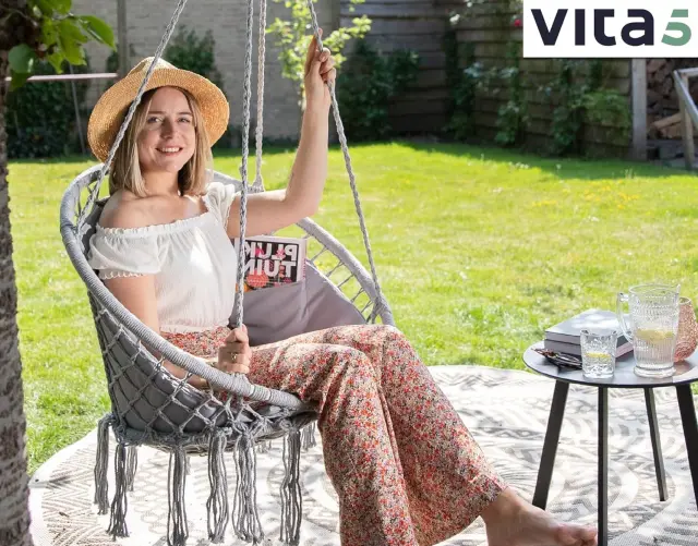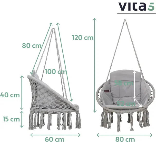 Viseči stol VITA5 predstavlja udobno in stilsko dovršeno rešitev za opremljanje vašega vrta, balkona ali notranjih bivalnih prostorov. Izdelek je izdelan iz visokokakovostnega bombaža, ki v kombinaciji z mehko blazino zagotavlja visoko raven udobja pri vsakodnevni uporabi. Robusten jeklen okvir nudi potrebno varnost in stabilnost, kar omogoča brezskrbno sprostitev v različnih okoljih. Stol je zasnovan tako, da se estetsko poda v vsak dom, hkrati pa nudi funkcionalno zavetišče za počitek.