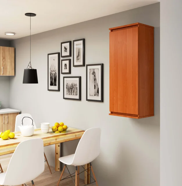 Omarica je bila ustvarjena za dopolnitev okusne stenske enote. Sodobna zasnova, trdna konstrukcija in enostavna uporaba to pohištvo naredijo priljubljeno izbiro za tiste, ki želijo ustvariti funkcionalen in vizualno privlačen prostor v svojem domu. Viseča vitrina je zasnovana tako, da za odpiranje ne potrebuje ročajev. To pohištvo se odlikuje po odpornosti na poškodbe in trajnosti. Zaradi načina montaže na steno je mogoče površino čistiti s čistilnimi roboti.