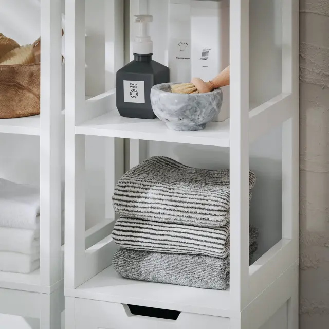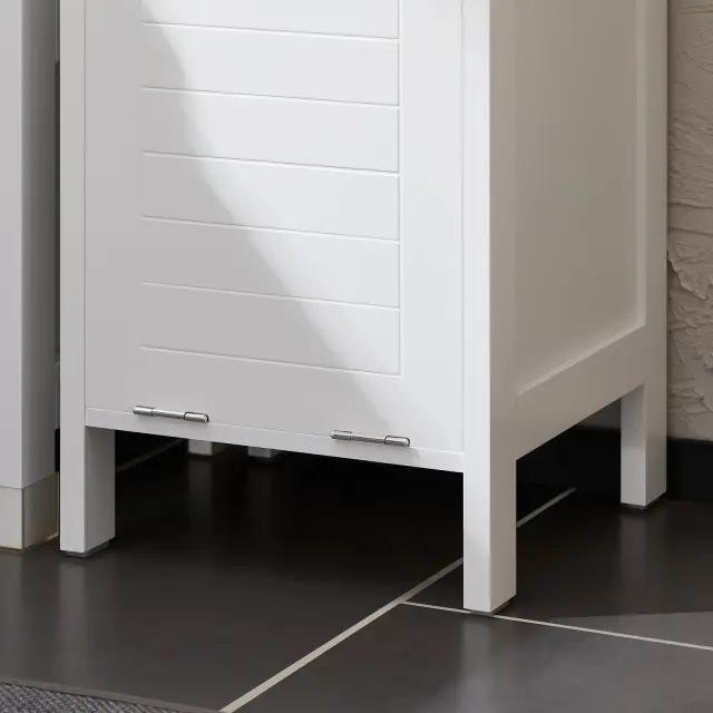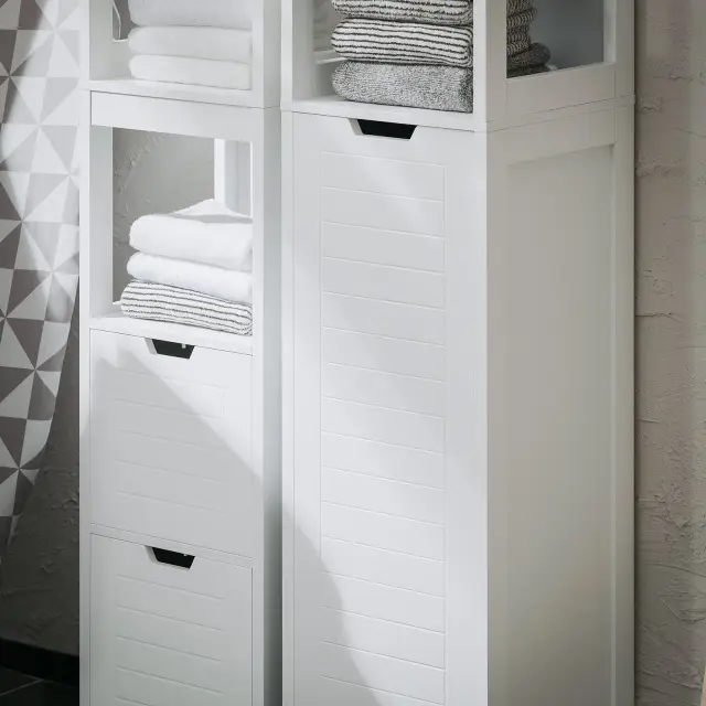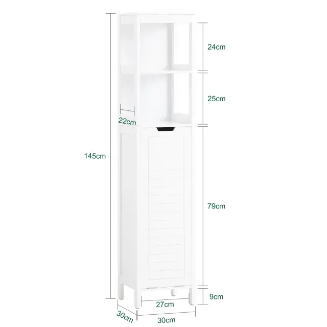 Ta kopalniški predalnik ne ustvari le veliko prostora za shranjevanje stvari, ki jih potrebujete za vsakodnevno nego, temveč s svojim privlačnim dizajnom v vašo kopalnico ustvari domače vzdušje. Z visoko in preprosto omarico boste končno imeli dovolj prostora za shranjevanje stvari v kopalnici in ohranili urejen videz. Košare in police nudijo dodaten prostor za shranjevanje vaših kopalniških dodatkov in kozmetike. Zaradi borovih nog je to pohištvo bolj stabilno, noge pa vam omogočajo boljšo zaščito barve pred vlago. Veliko prostora za vsakdanje stvari v kopalnici Polica je zelo varna zahvaljujoč napravam proti prevrnitvi in ​​nedrsečim plastičnim blazinicam na nogah police. Podrobnosti izdelka: Teža: 12,6 kg; Testirano za: 20 kg. Material: lesna vlakna. Mere izdelka: 30x30x145 cm (glej sliko); Dimenzije paketa: 100x37x16 cm. Z navodili za montažo in vijaki. Enostavna namestitev.