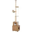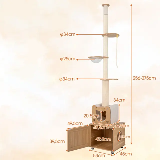 Igrišče "vse v enem" za mačke ima tristopenjsko nastavitev višine in ročno ročico za natančno nastavitev, da se popolnoma prilega vašemu stropu. Model z nastavljivo višino vključuje večnamensko pohištvo za mačke, v katerem je skrito stranišče za smeti, ki učinkovito zadržuje vonjave in zmanjšuje umazanijo. Prostorska kapsula vam omogoča, da opazujete svoje mačke, medtem ko se igrajo ali počivajo. V celoti ovite praskalnice iz sisala zadovoljijo naravni instinkt praskanja. Nastavljive blazinice za noge zagotavljajo trdno stabilnost, tako da se drevo za visoko plezanje varno drži tudi na neravnih tleh.