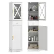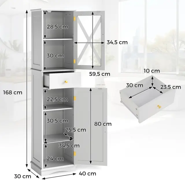 Z našo visoko kopalniško omarico poskrbite za varnost svojih stvari in urejenost prostora. To prostostoječo visoko omarico odlikujeta trdna lesena konstrukcija in mehanizem proti nagibanju za večjo stabilnost in varnost. S svojimi tankimi dimenzijami 40 x 30 x 168 cm (dolžina x širina x višina) učinkovito izkorišča navpični prostor. Poleg tega ta kopalniška omarica z 1 predalom, 2 vrati in 3 nastavljivimi policami ponuja vsestranske in prilagodljive rešitve za shranjevanje. Ta elegantno oblikovana omarica ima vrata iz kaljenega stekla in ročaje v zlati barvi, ki vaši kopalnici ali dnevni sobi dodajo sodoben pridih.